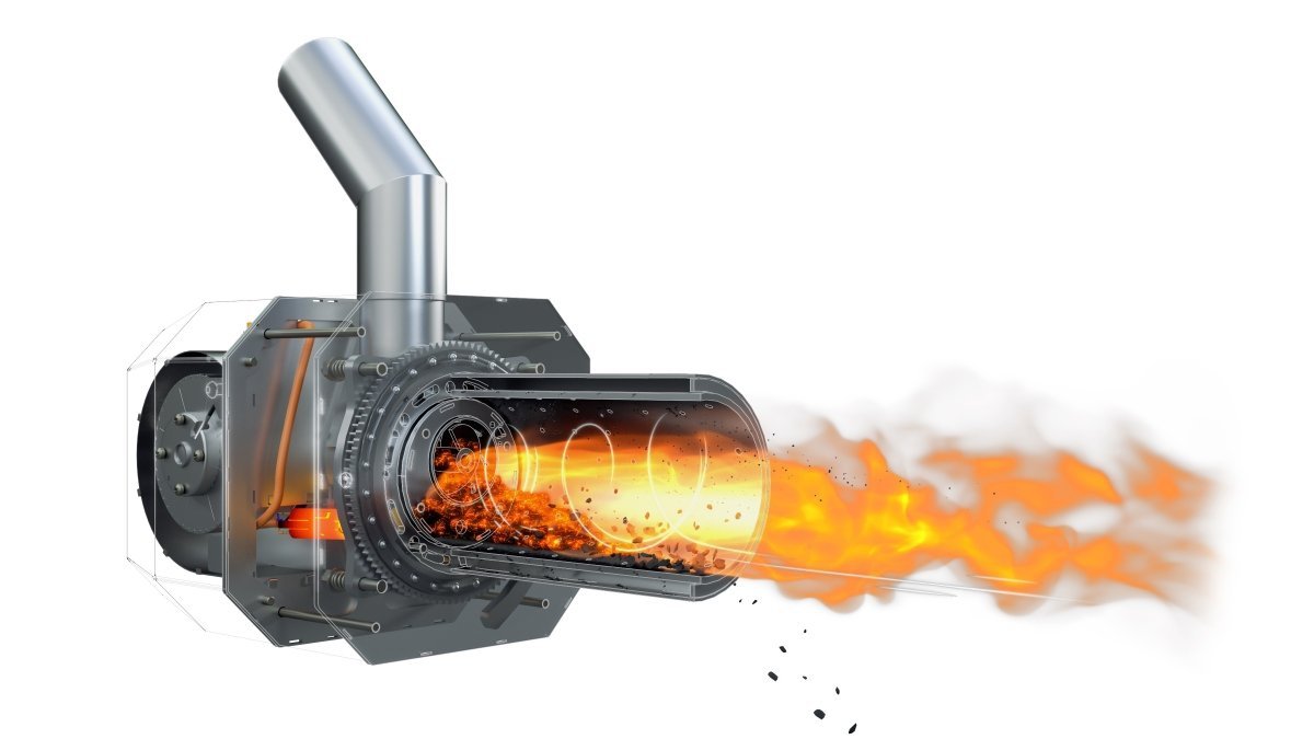rozwiązanie polegające na zastosowaniu rotacyjnej komory spalania oraz komory nadmuchowej eliminuje wszelkie problemy związane z narastaniem i gromadzeniem się zgorzeli w obu komorach. Zastosowaliśmy cykliczne wzruszanie paleniska poprzez obrót komory, w której zachodzą procesy powstawania zgorzeli, spieków i popiołów. Dzięki temu w sposób ciągły odprowadzamy produkty spalania z komory paleniskowej i nadmuchowej, nie wpływając na utratę mocy palnika i jednocześnie unikamy występującego w innych dostępnych na rynku palnikach problemu: zapychania się komory. Czyli palnik cały czas pracuje efektywnie.